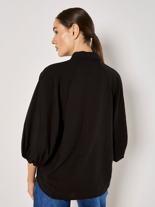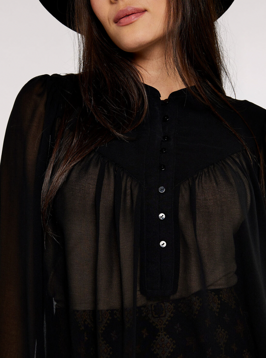Apricot- Black Woven Puff Sleeve Button Up Top