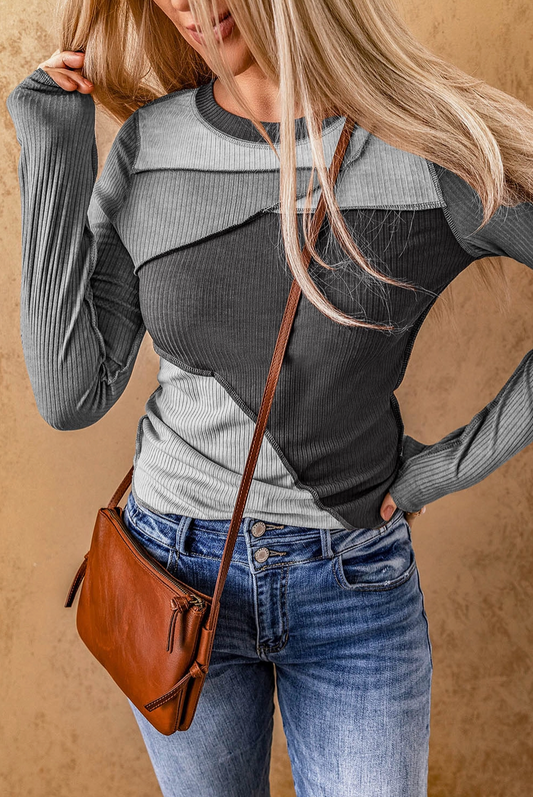 Full Time- Expose Seam Color Block Ribbed Knit Top in Grey