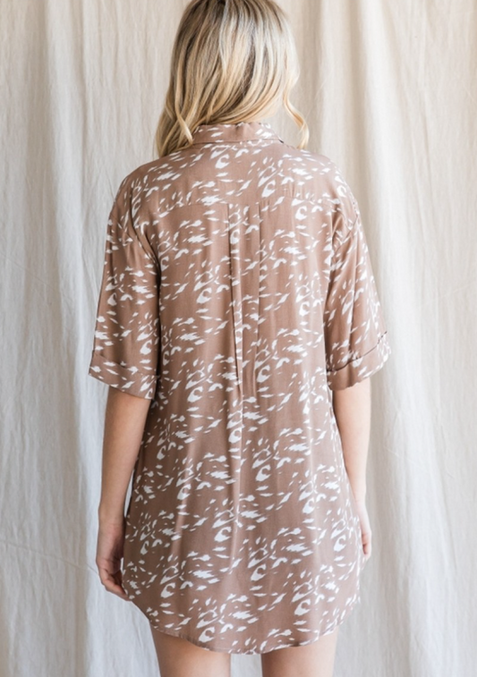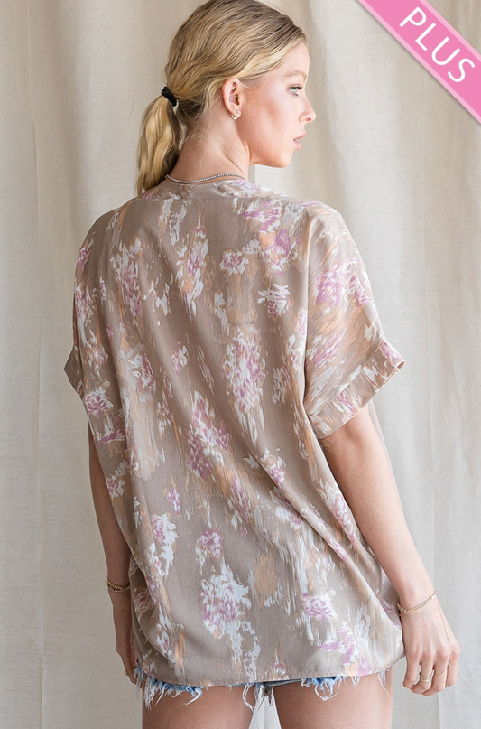Jodifl- Boxy Top V-Neck Dolman in Taupe Print