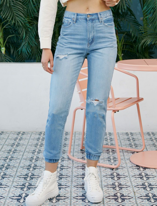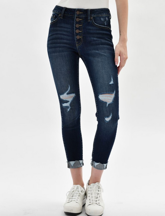 Kancan Denim- Valley High Rise Button Front Denim with Distress in Dark Wash