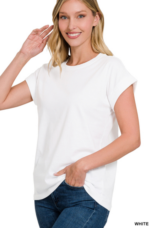 Zenana- Plus Size Rolled Short Sleeve V-Neck in Cream