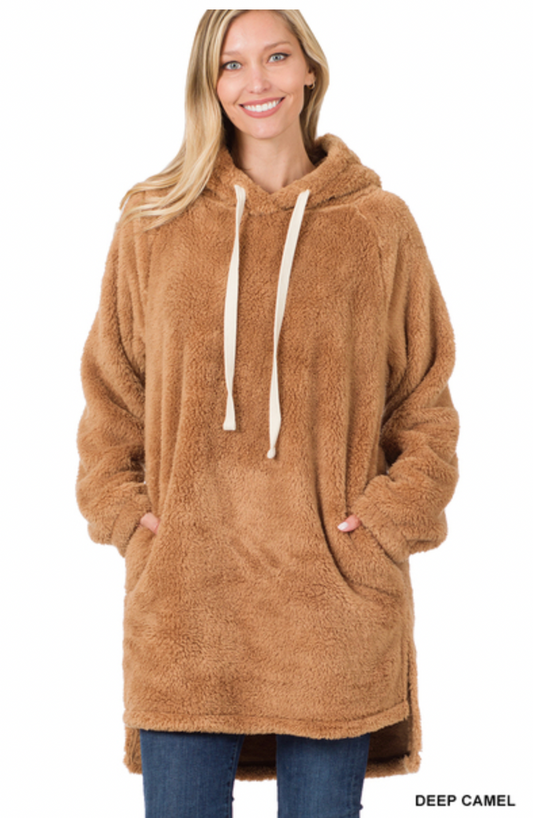 ZENANA- HOODED FAUX FUR HI-LOW HEM PULLOVER