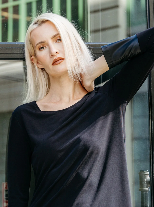 Clara Sun Woo- Parachute Hem Liquid Leather Cuff Tunic in Black