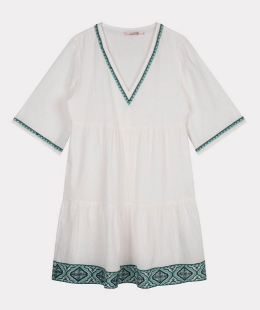 Esqualo- V-Neck Dress with Embroidery Details in White